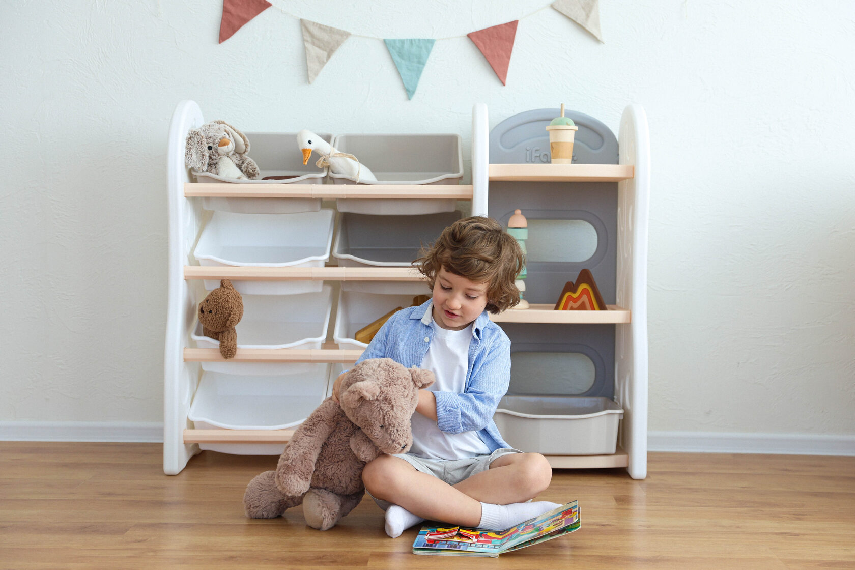 Чтобы ребенок научился самостоятельно убираться, нужно ему помочь. Шкафы, стеллажи и комоды должны быть низкими, легко открываться или вообще не иметь дверей – пусть весь визуальный шум «прячется» в коробках и ящиках.